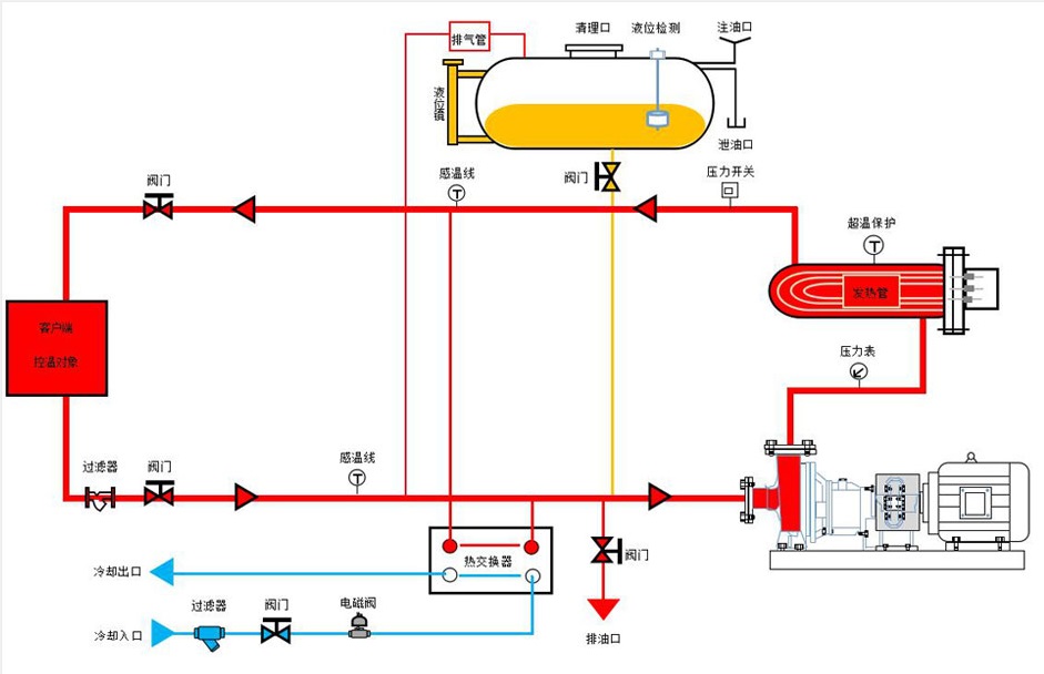 后,重新通過(guò)循環(huán)泵,回到加熱器,再吸收熱量,傳遞給用熱設(shè)備,如此周而復(fù)始,實(shí)現(xiàn)熱量的連續(xù)傳遞,使被加熱物體溫度升高,達(dá)到加熱的工藝要求.